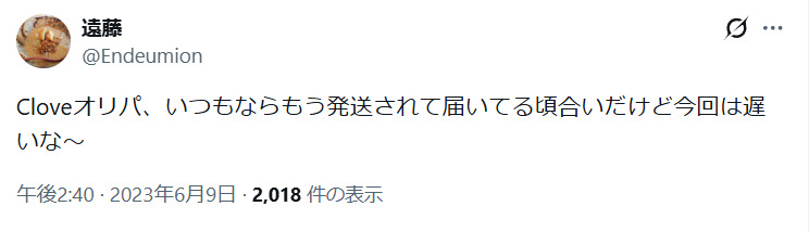 Cloveオリパに関してガチャでの当たり報告や無料でアドが取れたなどの投稿が目立っていたが、当選品がなかなか発送されないという声も出ている。
