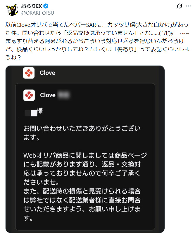 Cloveオリパから届いたカードに傷があり、問い合わせたところ返品や交換の対応などはしてもらえなかったという旨の投稿も見つかった。
