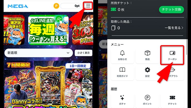 MEGAオリパでは公式LINEを友達追加すると定期的にクーポンコードがもらえます。