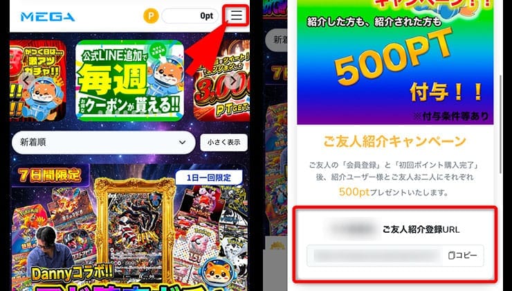 MEGAオリパでは友達招待用のURLが用意されており、このURLリンクからサイトに登録し、初回課金をすると500ポイントがもらえます。