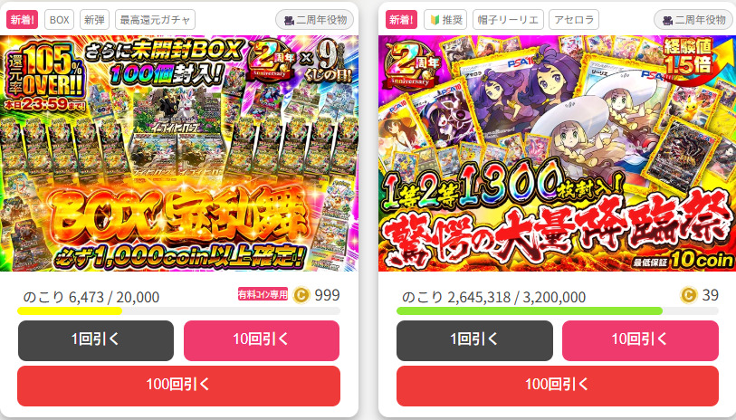 当たりカードを引ければ購入額以上の価値のカードが手に入るといった宝くじのような要素があります。