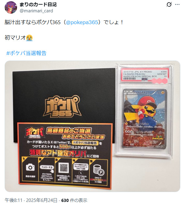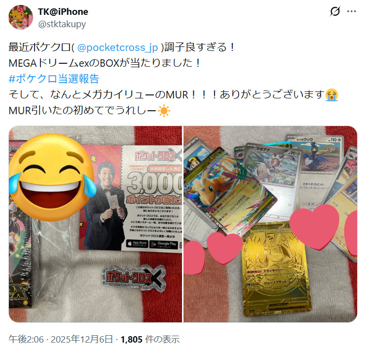 Xで「#ポケパ当選報告」と検索すると、ポケパ365で当たりカードを当てた人の写真付きの投稿が数多く見つかりました。