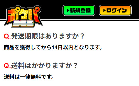 ポケパ365は送料が無料で1~14日以内に商品を発送する旨が公式サイトに記載されており、最短翌日に発送早くて依頼から2日後には届きます。