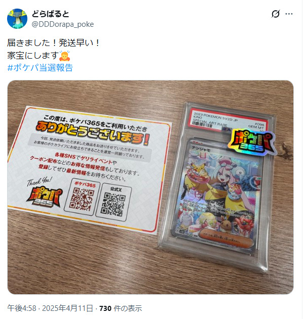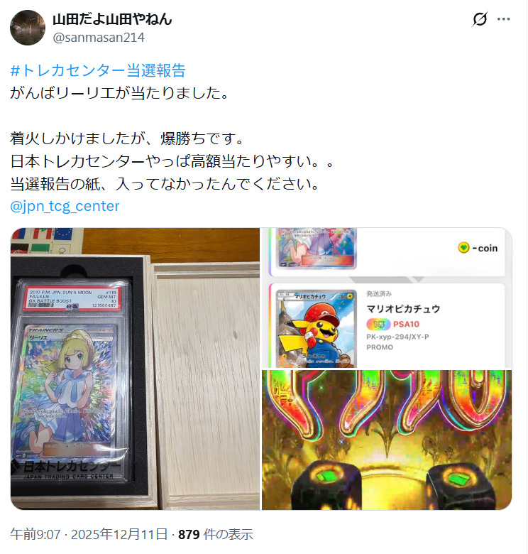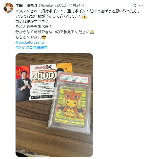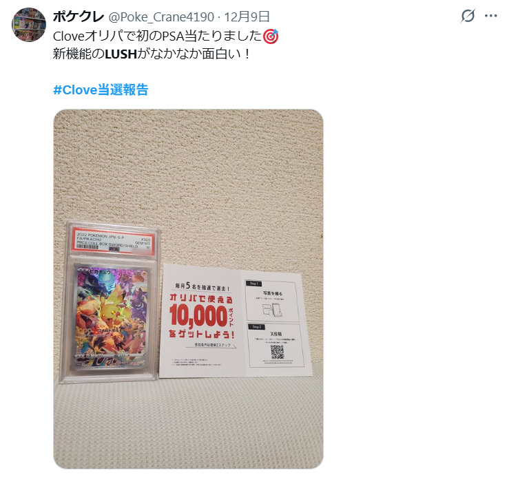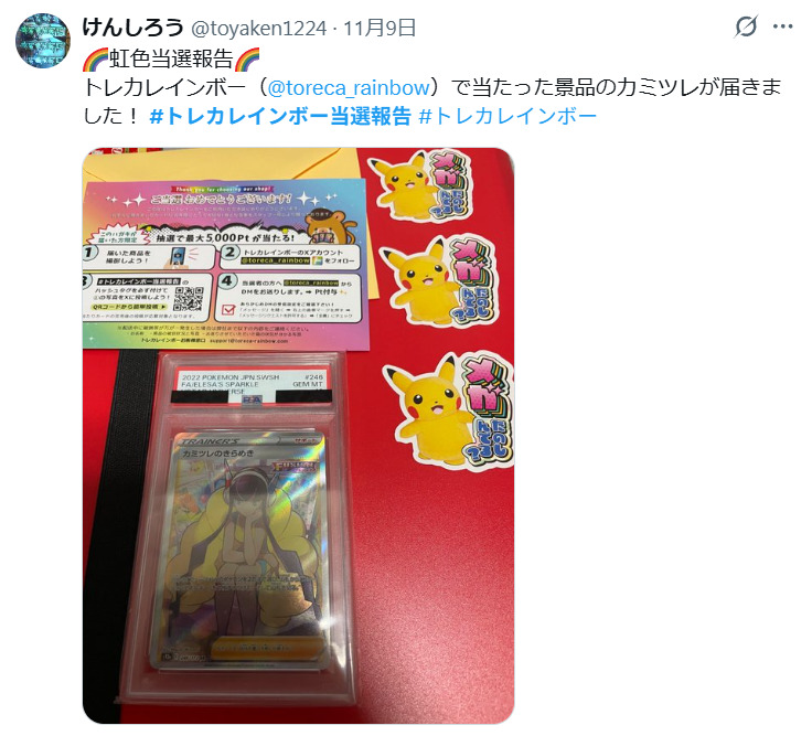 他サイトと比べてトレカレインボーの当たり報告は少なめですが、PSA10が当たったという投稿をいくつか見つけることができました。