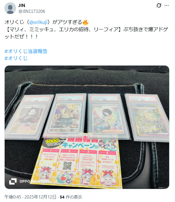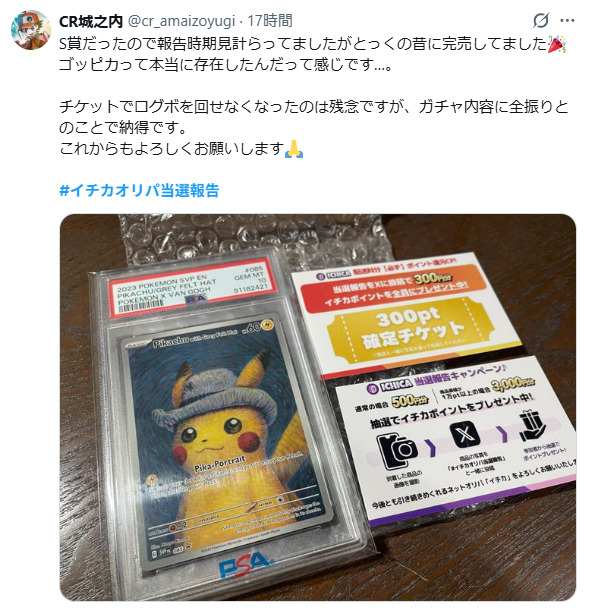 Xで調べたところALPHAオリパで当たりカードを当てた人の写真付き投稿が見つかりました。