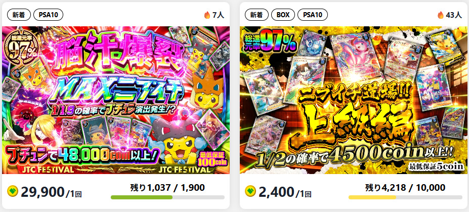 ポケカ専門のオンラインオリパで特にPSA10や高額カードが豊富。価格帯は1円から引けるものから1万円以上まで幅広く、還元率は100%越え!