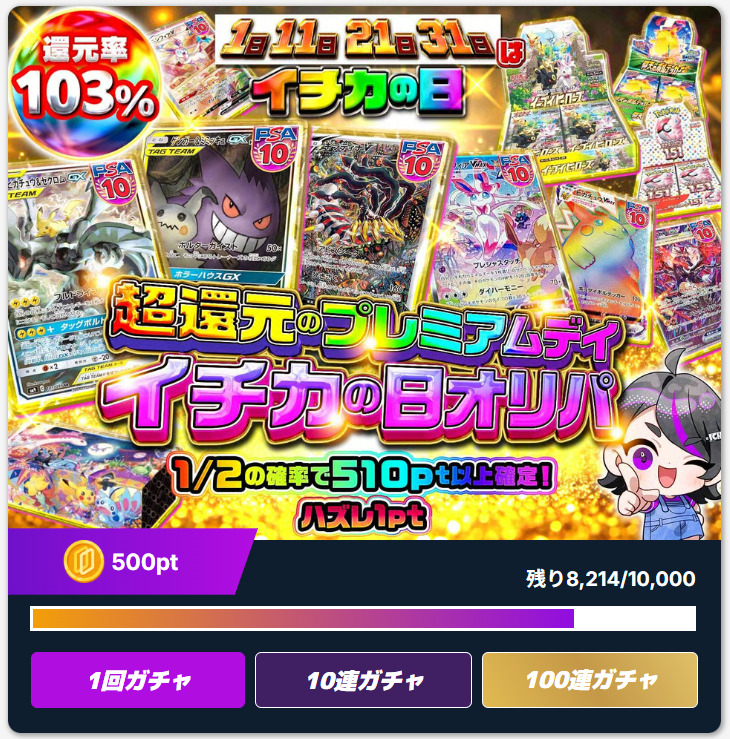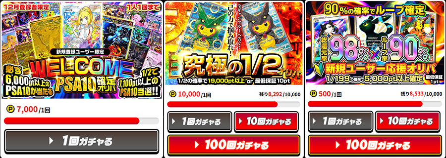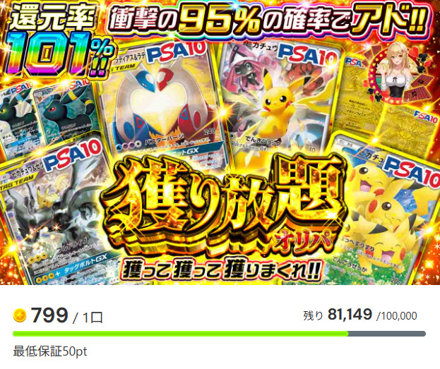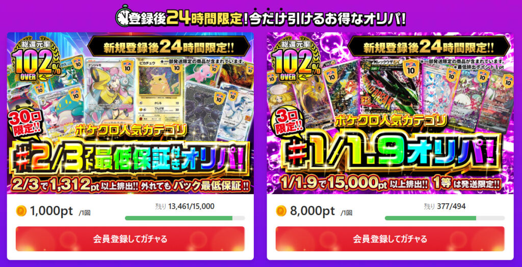 使った分のポイントが必ず返ってくるオリパが数種類販売中。口数もかなり少ないため、当たりを狙いやすいです。