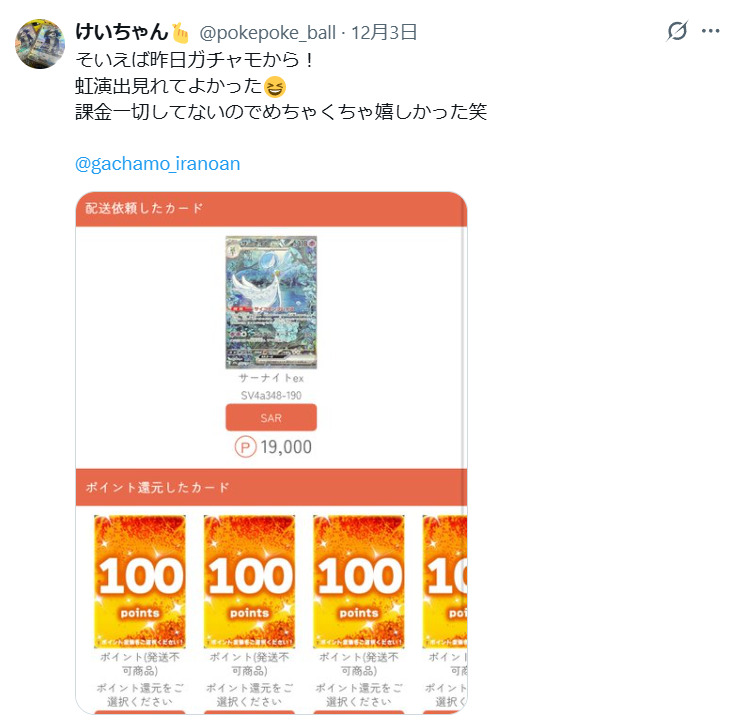 他サイトと比べてガチャモの当たり報告は少なめですが、課金なしで相場1万円以上のカードが当たったという投稿が直近で見受けられます。