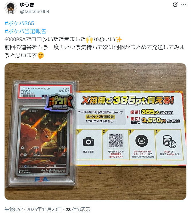 ポケパ365では届いた商品の画像をハッシュタグとともにXで投稿するだけでポイントがもらえるキャンペーンを実施中。当選報告をするだけで確定で365ポイントもらえます。